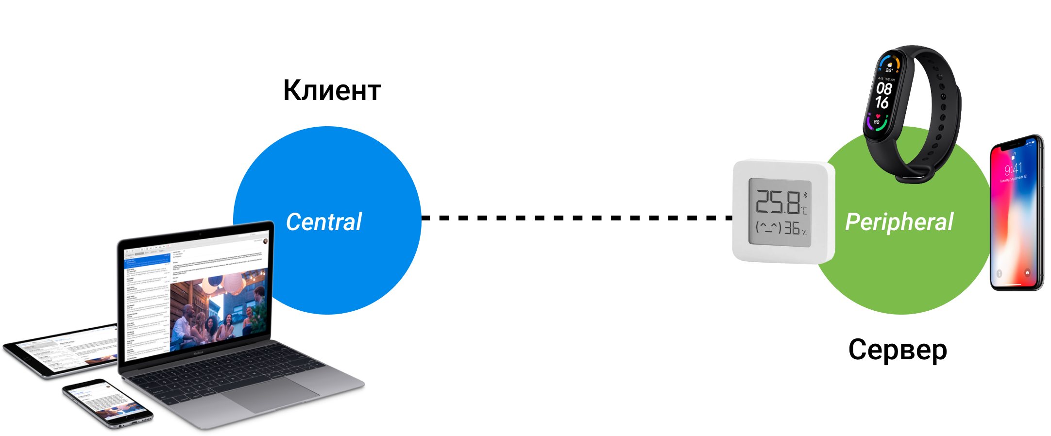 Итак, CoreBluetooth. Как уже было сказано, появился в iOS 5, был серьезно доработан в iOS 6 и существует до сих пор, не претерпев каких-либо серьезных изменений с тех пор. Как я уже сказал, всё взаимодействие строиться на классической клиент-серверной модели и в CB у нас есть сервер – Peripheral и клиент Сentral. Такой нейминг может слегка путать некоторое время, т.к. мы привыкли что именно сервер является неким центром, а CB переворачивает все с ног на голову. Но с другой стороны всё логично: Peripheral device — периферийное устройство, внешнее по отношению к нашему, центральному. Peripheral device’ом может быть фитнес трекер, умная лампочка, замок или целая система умного дома, а может быть и другое мобильное устройство или компьютер.