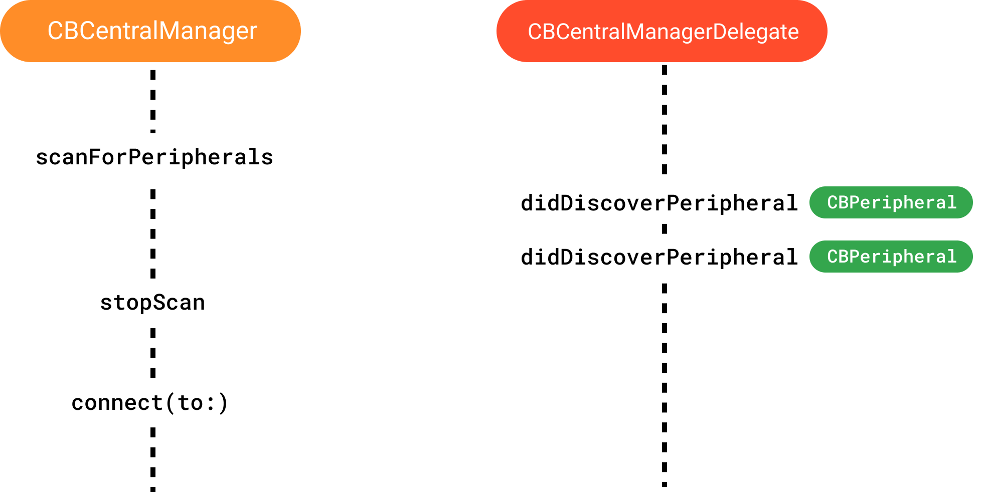 Как только мы будем готовы сканировать эфир, нужно вызвать метод scanForPeripherals у менеджера CBCentralManager. Как только наше устройство увидит новый рекламный пакет, будет вызван метод делегата didDiscoverPeripheral с объектом CBPeripheral в параметрах метода. Когда мы найдем нужное устройство или устройства, нам нужно остановить сканирование методом stopScan и вызвать connect указав экземпляр класса CBPeripheral.