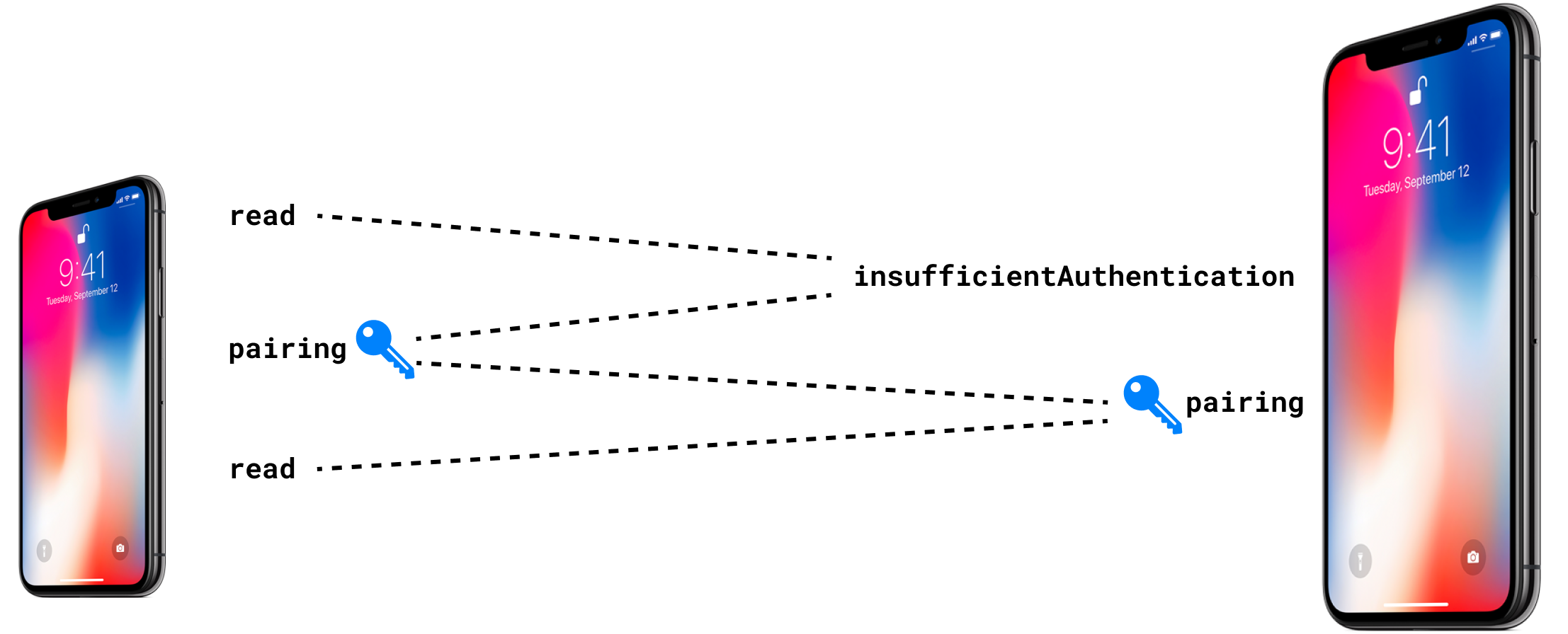 В случае, когда требуется дополнительная защита, можно установить соотвествующие права на характеристику. При попытке чтения или записи такой характиристики сервер отклонит процесс, сообщив, что общение должно быть зашифровано, ответив на запрос ошибкой Insufficient Authetication. Чтобы продолжить, клиенту нужно создать защищенное соединение, которые мы чаще привыкли называть пейрингом, реже — бондингом.