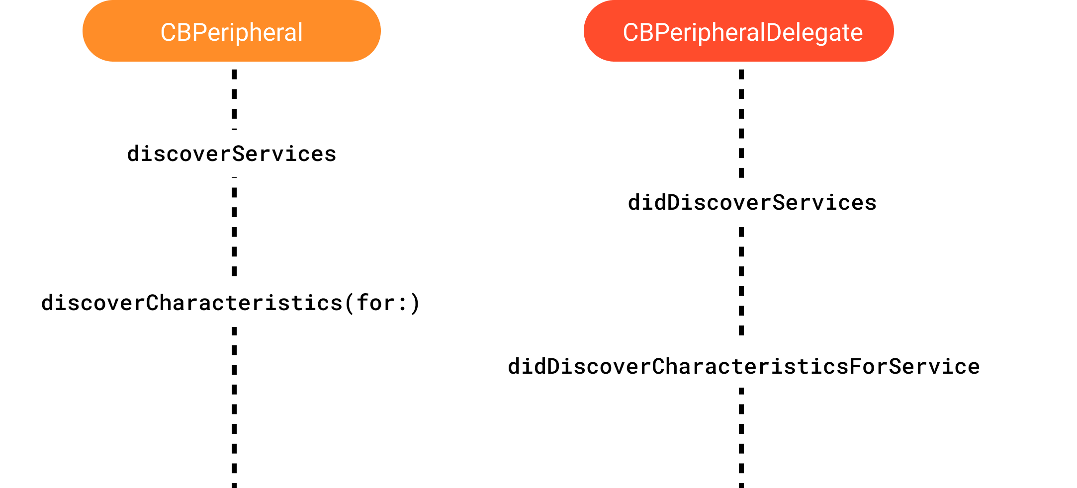 Как только соединение будет установлено, мы можем начать опрашивать устройство. С этого момента мы уже работаем с объектом CBPeripheral и его делегат CBPeripheralDelegate которые представляют внешнее устройство, к которому мы подключились. Чтобы считать какое-то значение (характеристику) сначала нужно найти сервис, в составе которого эта характеристика существует. Запустим поиск сервисов. Мы можем как указать сервис или сервисы которые нас точно интересует, либо не указывать их и найти все, что реализует устройство.