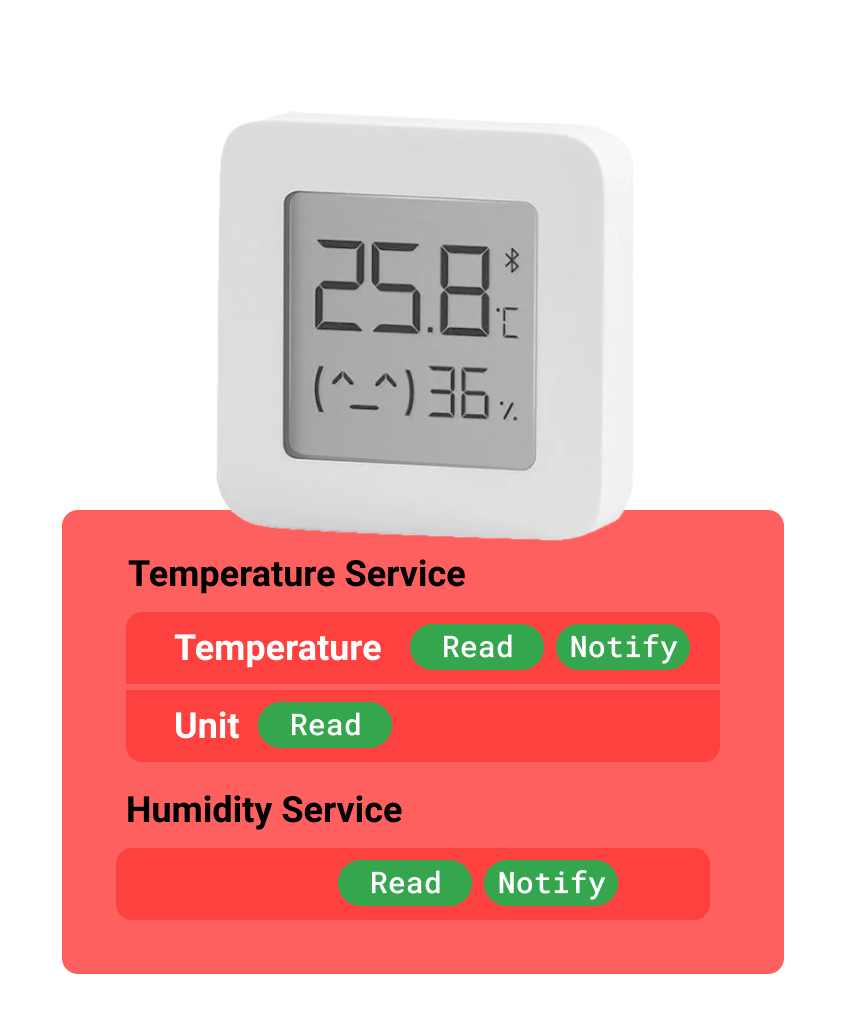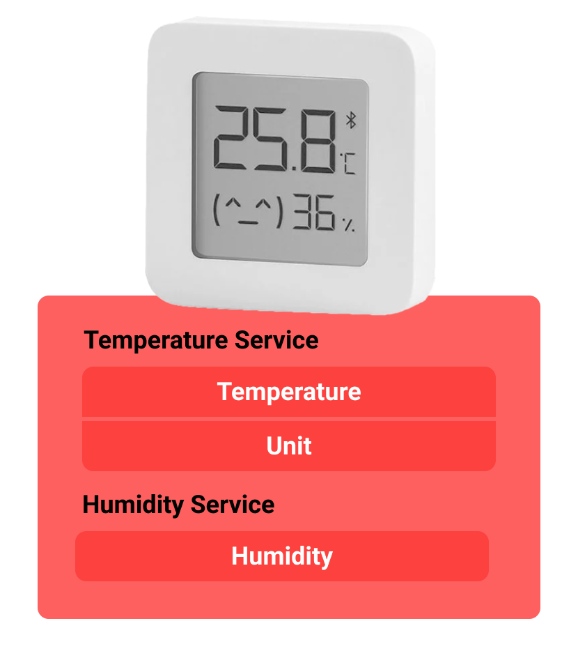 Основой BLE является профиль GATT – General Attribute Profile, который предоставляет нам абстракции сервиса и характеристик. Характеристика — это, грубо говоря, ячейка данных, а сервис — это некоторое логическое их объединение. Может звучать непонятно, но сейчас я приведу пример и всё сразу встанет на свои места. Самый классический и на самом деле распространенный пример — термометр. Он может иметь сервис измерения температуры и иметь две характеристики: единицу измерения (℃, ℉) и собственно саму температуру. А еще он может определять влажность и для неё будет отдельный сервис с одной лишь характеристикой — влажности в процентах.