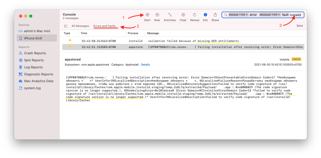 Когда нам не пишут причины проблемы на на экране, мы лезем в логи! Открываем приложение Console (не путать с терминалом) и подключаем свой девайс. Находим его в списке слева, стартуем снятие логов, попутно отфильтровав ошибки и включив вывод только от installd (сервис установки приложений в iOS). Запускаем установку приложения на девайсе и ждем.