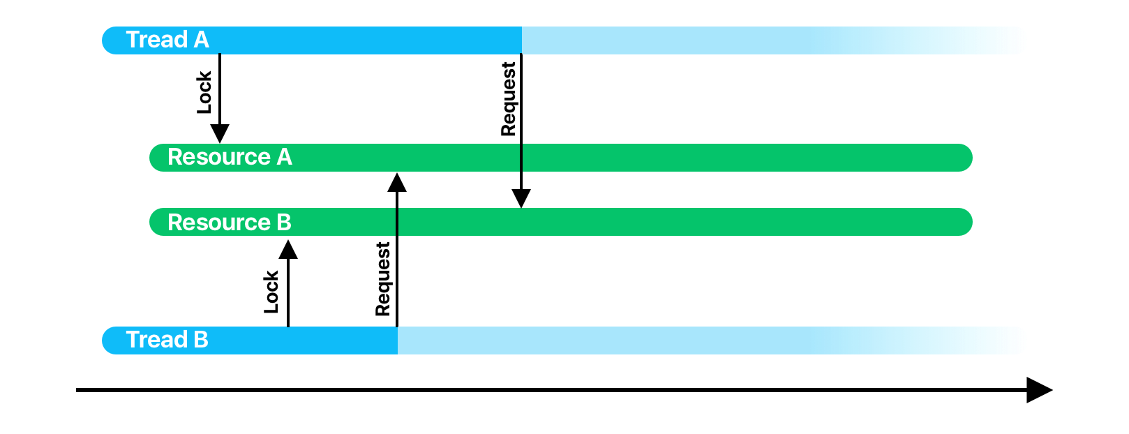 Разберем на примере. Допустим задача, в потоке А блокирует доступ к некому ресурсу А, пусть это будет некий SettingsStorage. Задача А блокирует доступ к стораджу, читает оттуда некоторые значения, и что-то вычисляет. В это время стартует задача B и блокирует доступ к ресурсу B, пусть это будет база данных. Чтобы выполнить некоторые вычисления задаче В тоже потребовался доступ к SettingsStorage и задача начинает ждать, когда задача А его освободит. В это время, задаче А понадобился доступ к БД, но он уже заблокирован задачей В. Происходит взаимна блокировка: задача А ожидает БД, которая заблокирована задачей В, которая ожидает сторадж, заблокированный задачей А.