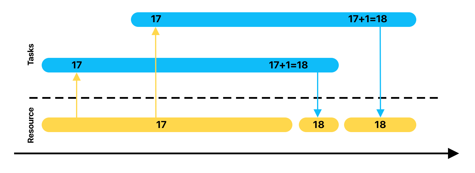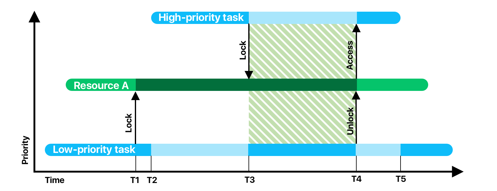 Пусть у нас есть всего две задачи с разным приоритетом и всего 1 ресурс, пусть это снова будет БД. Первым в очередь помещается задача с низким приоритетом. Она выполняет свою работу и в момент времени Т1 ей понадобилась БД и она блокирует доступ к ней. Почти сразу же после этого, стартует высокоприоритетная задача и вытесняет низкоприоритетную. Все идет по плану до момента Т3, где высокоприоритетная задача пытается завладеть БД. Так как ресурс заблокирован, задача высокоприоритетная задача переводится в ожидание, а низкоприоритетная получает процессорное время. Временной промежуток T3-T4 называют ограниченной инверсией приоритетов. В этом промежутке наблюдается логическое несоответствие с правилами планирования — задача с более высоким приоритетом находится в ожидании в то время как низкоприоритетная задача выполняется.
