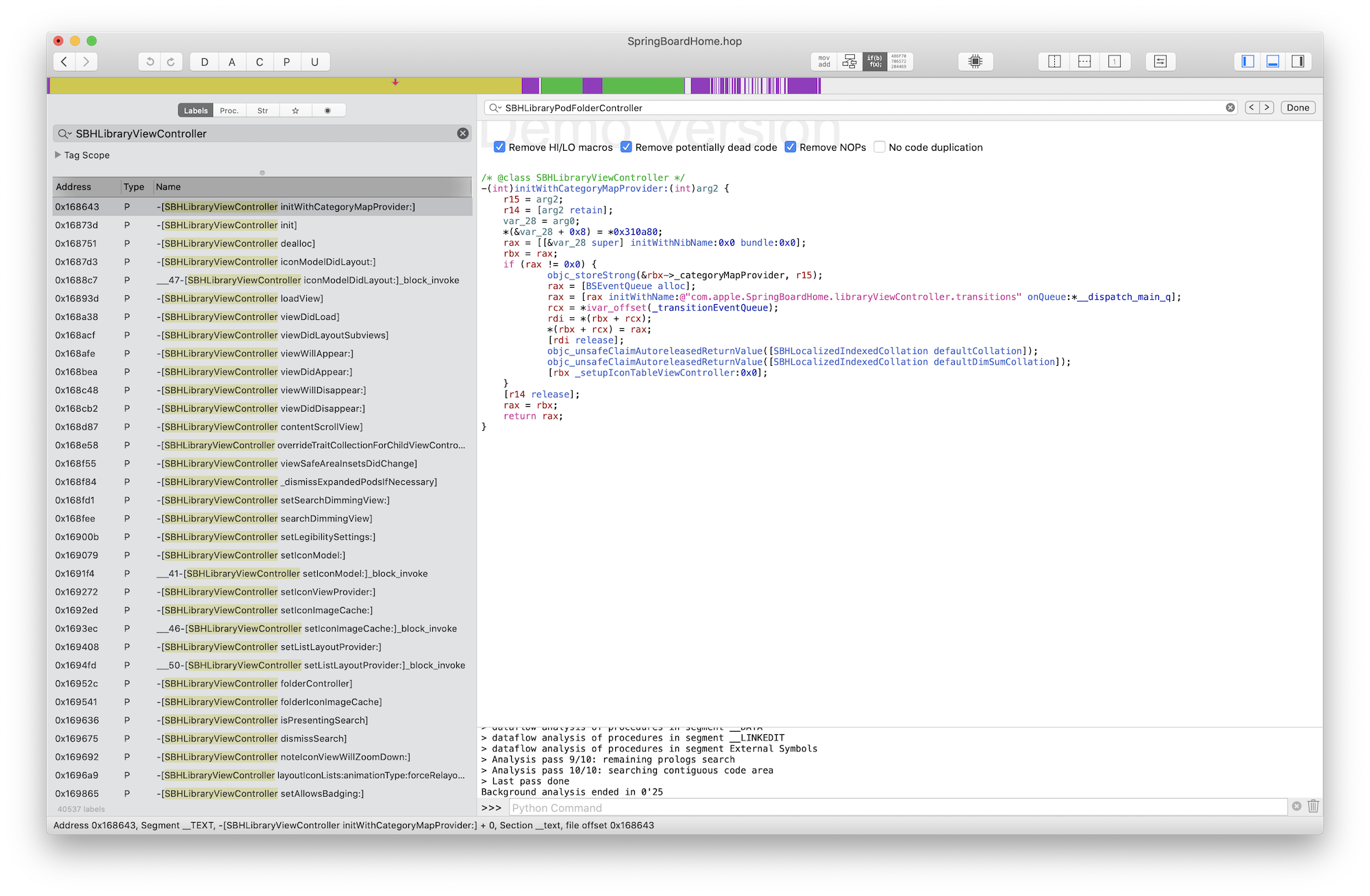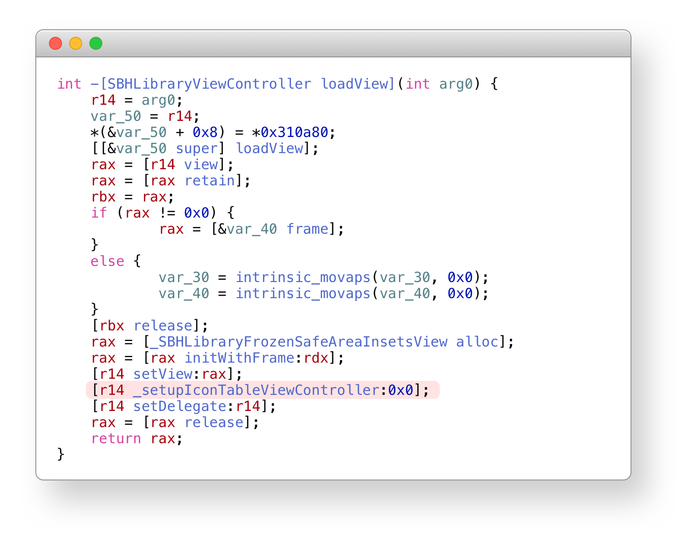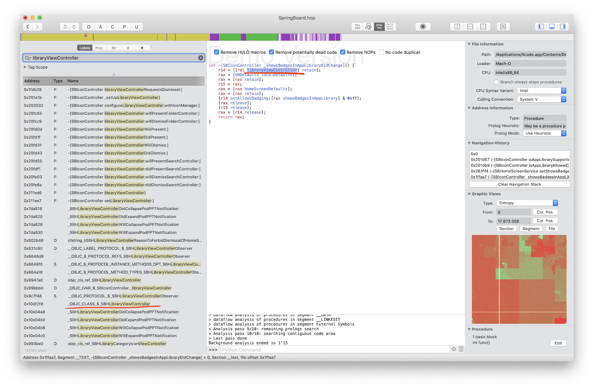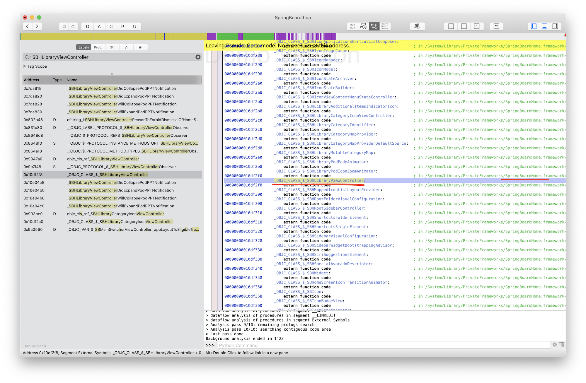 Вот и символ _OBJC_CLASS_$_SBHLibraryViewController, но нажатию на который мы можем увидеть, что объявлен он в соседнем фреймворке SpringBoardHome. Грузим его в Hopper! Теперь найдем и покопаемся в классе SBHLibraryViewController.