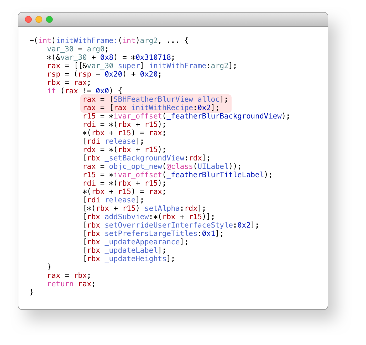 И почему я раньше просто не поискал по строке Blur?! Ладно, не время себя винить, глянем что внутри. Первым делом видим initWithFrame, где создается SBHFeatherBlurView методом initWithRecipe: с параметром 0x2.
