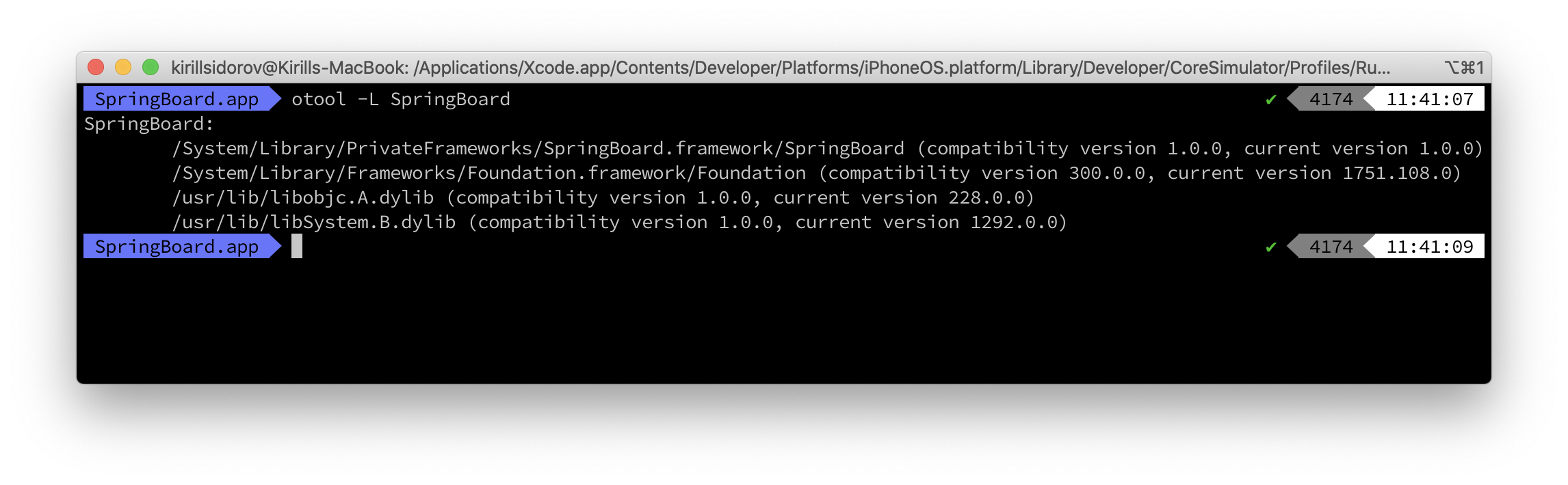 Как и ожидалось, внутри исполняемого файла ничего полезного нет. Лишь несколько процедур отвественных за старт. Значит интересное нам прячется где-то в системных фреймворках. Посмотрим с чем слинкован исполняемый файл.
