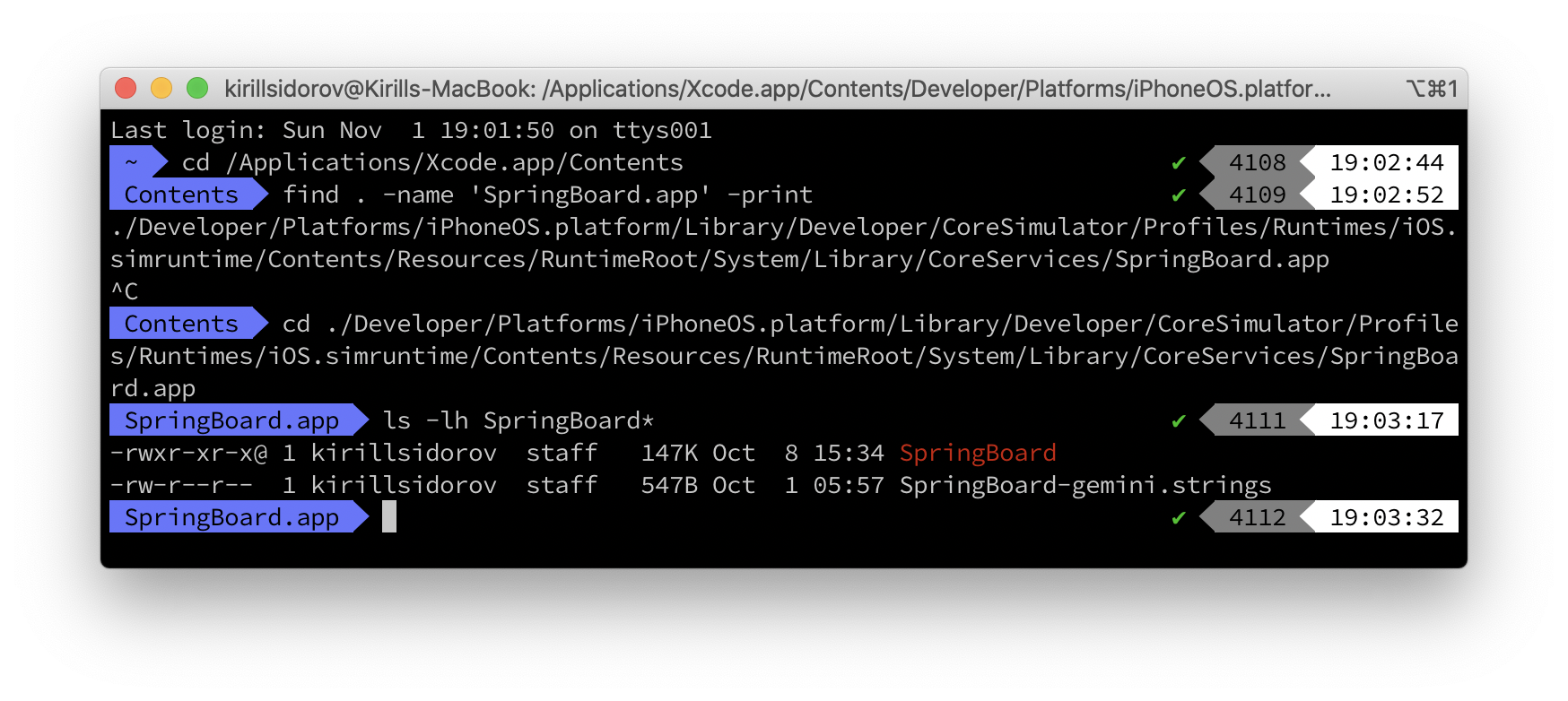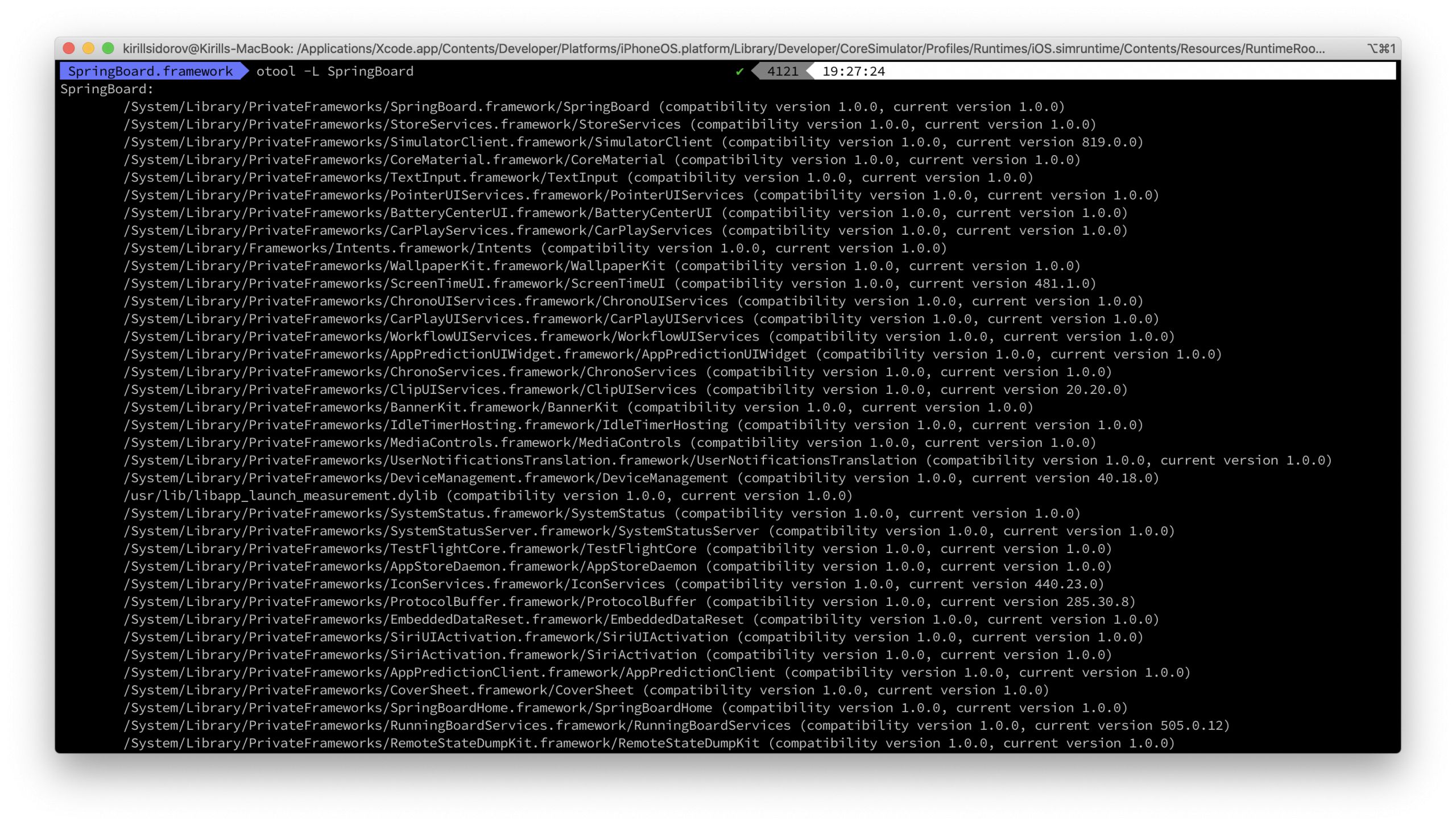 Много анализировать не приходится, «кишки» SpringBoard’а находятся в одноименном приватном фреймворке. Вернемся вверх по дереву файлов до iOS.simruntime и поищем его относительно этой директории. А вот и папка с приватными библиотеками и нужный нам фреймворк! Грузим в дизассемблер.