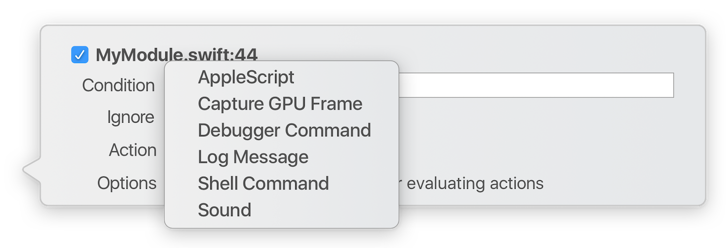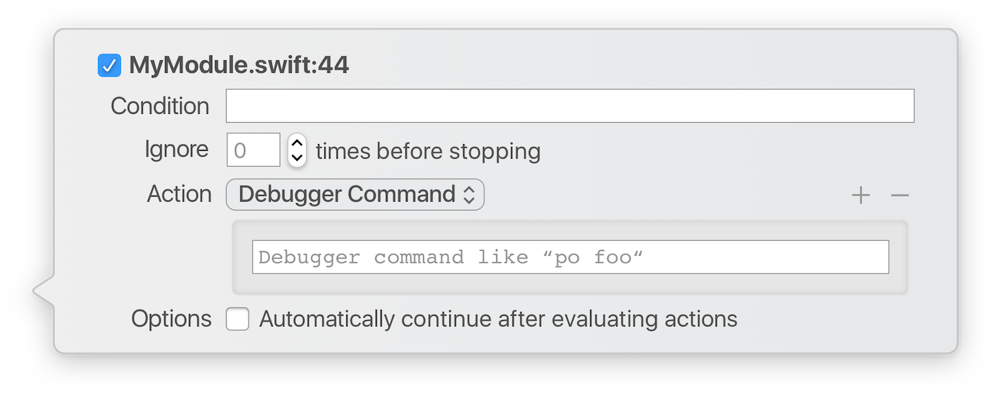 Одним из самых интересных видов экшенов я считаю «Debugger command». Этот экшен позволяет действительно безгранично влиять на отлаживаемую программу. Debugger command — это команды отладчика LLDB, а LLDB — это отладчик для проекта LLVM, который сейчас используется Apple и Xcode для сборки программ. Отладчик LLDB позволяет подключаться к процессу, прерывать выполнение программы и воздействовать на её память. Для этого отладчик имеет множество команд, некоторые из которых станут героями сегодняшнего повествования. Именно благодаря отладчику LLDB у нас в принципе есть такая замечательная возможность отлаживать программу, в частности устанавливать брейкпоинты.