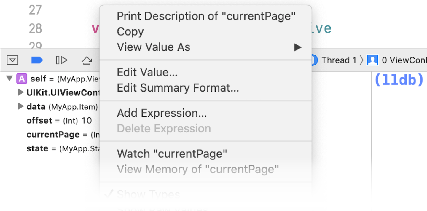 Вотчпоинты позволяют останавливать программу, когда изменяется значение переменной. Корректнее будет сказать, что этот механизм позволяет следить за изменениями памяти по заданному адресу с заданным размером, но благодаря LLDB и Xcode разработчику достаточно сделать несколько кликов. Использование вотчпоинтов будет удобным, когда за изменением переменной не следует никакого сайд-эффекта прямо после изменения, но её состояние важно для отложенных вычислений. В ряде случаев может быть непонятно, что инициирует это изменение, и вотчпоинты позволят быстро узнать это. Достаточно приостановить выполнение программы в контексте нужного класса и воспользоваться окном Variables View.